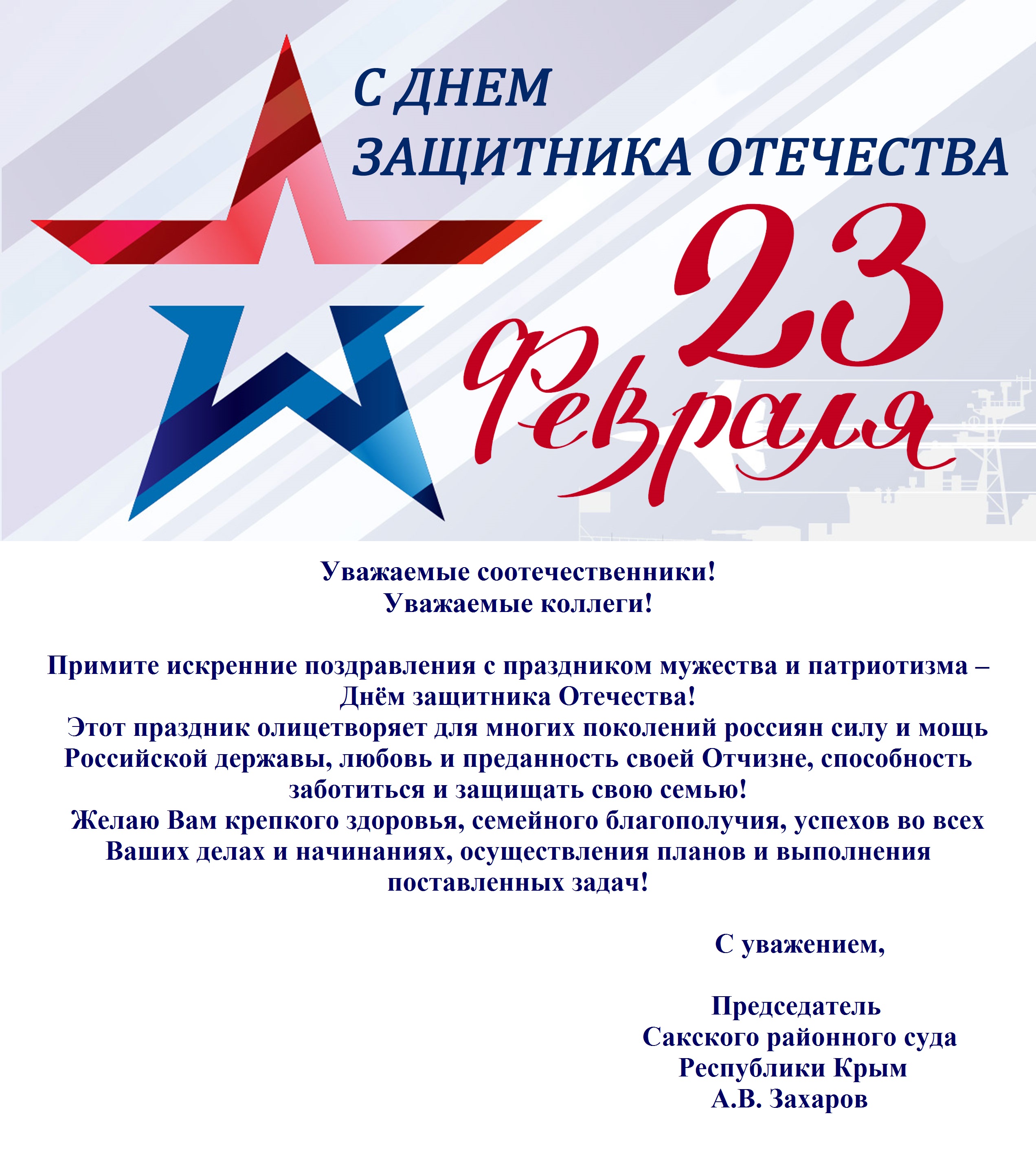 | Поздравление председателя Сакского районного суда Республики Крым Александра Владимировича Захарова с Днём защитника Отечества | версия для печати |