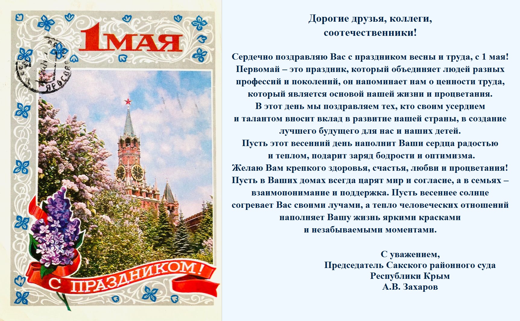 | Поздравление председателя Сакского районного суда Республики Крым А.В. Захарова с праздником весны и труда | версия для печати |