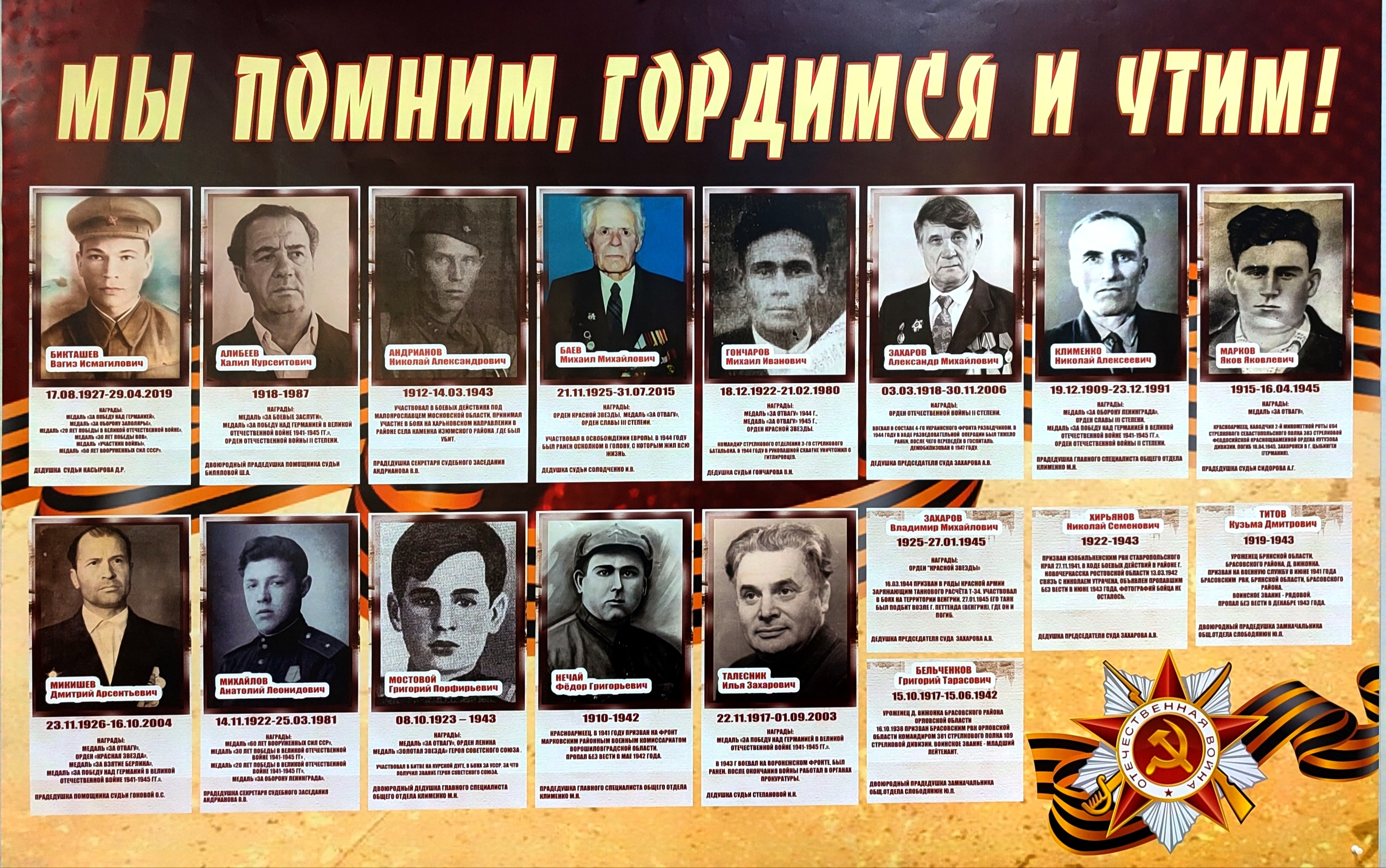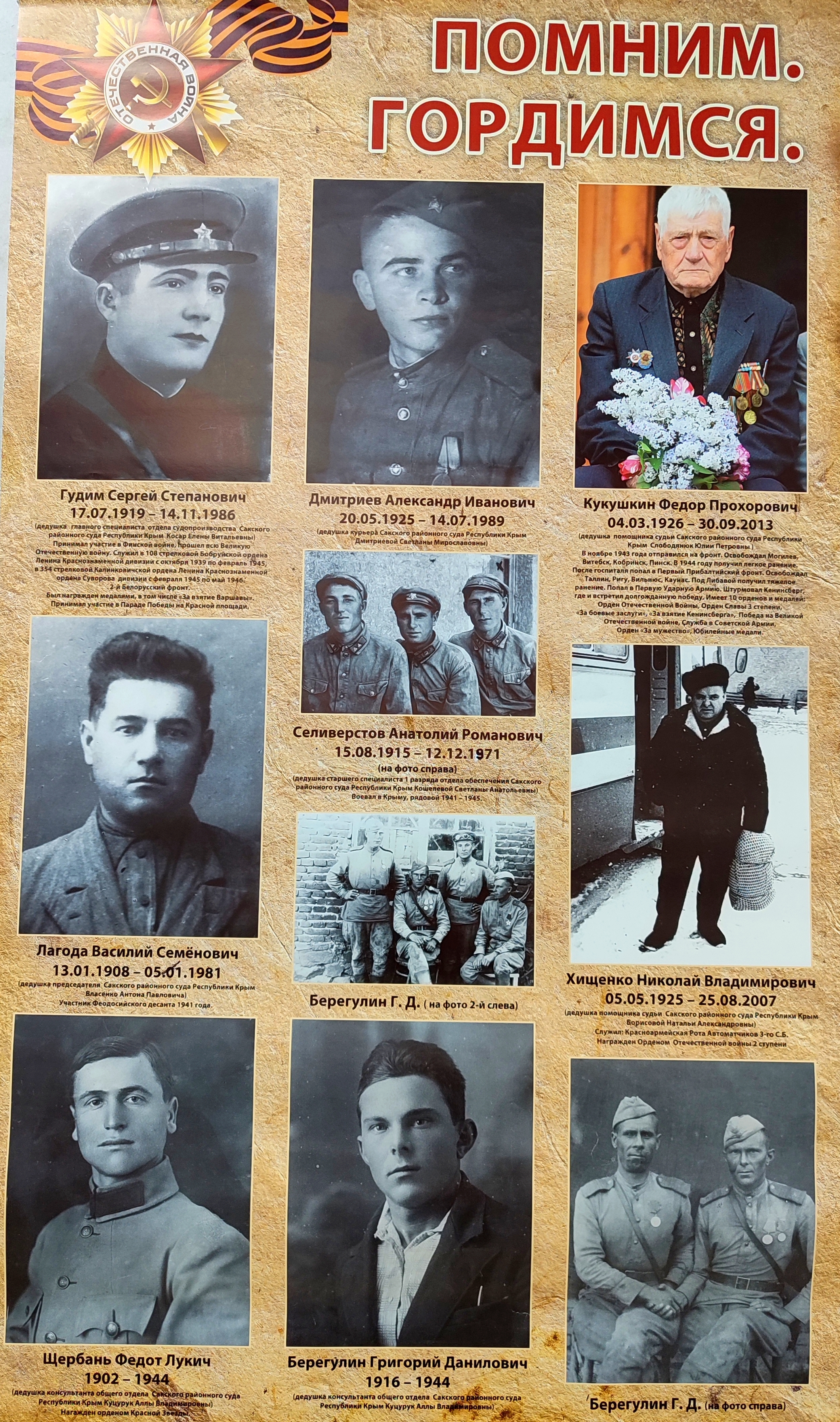 В преддверии празднования 80-летия Победы в Великой Отечественной войне в Сакском районном суде Республики Крым оформлена «Стена Памяти» с фотографиями родственников сотрудников суда, сражавшихся на фронтах Великой Отечественной - символ глубокого уважения и благодарности к подвигу предков, внесших неоценимый вклад в Победу. Оформление «Стены Памяти» - это результат кропотливой работы коллектива суда, который с трепетом собирал информацию о своих Героях, восстанавливал детали их биографий и искал сохранившиеся фотографии. В процессе работы сотрудники суда не только узнали много нового о своих семьях, но и ощутили особую связь поколений, осознали свою ответственность перед памятью предков. Наши родные, запечатлённые на пожелтевших снимках, смотрят на нас сквозь годы. Под каждым портретом - краткая биография, перечисляющая боевые заслуги, награды и жизненный путь. Эти люди, некогда молодые и полные надежд, отдали свои лучшие годы, чтобы защитить Родину. «Стена Памяти» в Сакском районном суде - это источник вдохновения для нынешнего поколения сотрудников суда. Она напоминает о важности служения закону и справедливости, о необходимости быть достойными памяти тех, кто отстоял свободу и независимость нашего Отечества. Это зримое подтверждение того, что подвиг Героев Великой Отечественной войны навсегда останется в наших сердцах, а их имена - в истории нашего суда и всей страны! Помним! Любим! Гордимся!