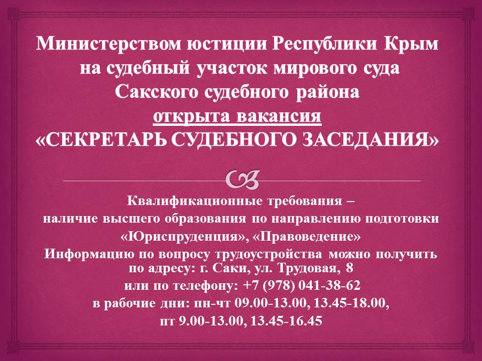 | Объявление о вакансии на судебном участке мирового суда Сакского судебного района Республики Крым | версия для печати |