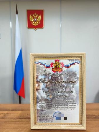 ![]() Коллектив Сакского районного суда Республики Крым получил слова благодарности от защитников нашего Отечества, от тех, кто каждый день стоит на страже интересов России. Командир 56 гвардейского отдельного батальона специального назначения и весь личный состав высоко оценили вклад Сакского районного суда Республики Крым в общее дело. Мы благодарим судей и работников аппарата суда за отзывчивость и активную гражданскую позицию. Переданная нами безвозмездная помощь уже работает на передовой, обеспечивая жизнедеятельность батальона и приближая нашу общую Победу. Только вместе мы – сила!
