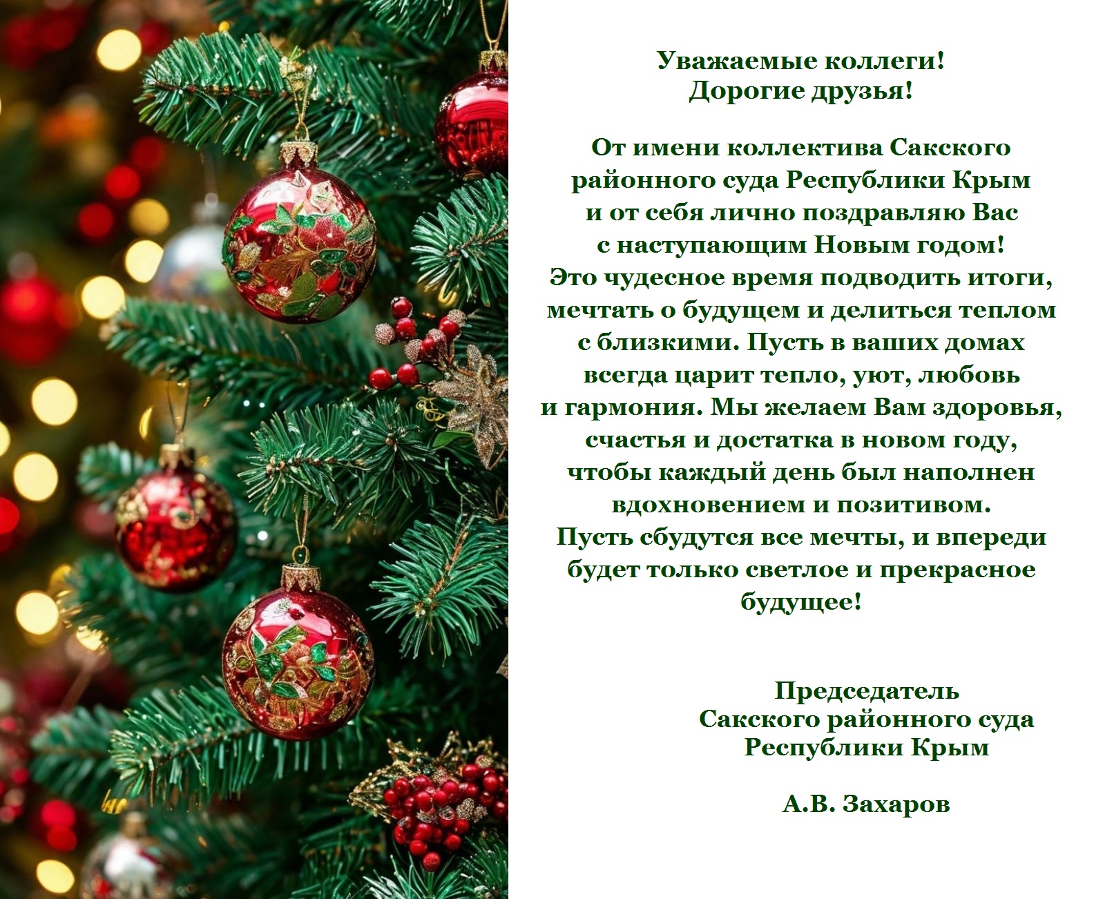 | Поздравление председателя Сакского районного суда Республики Крым А.В. Захарова с наступающим Новым годом | версия для печати |